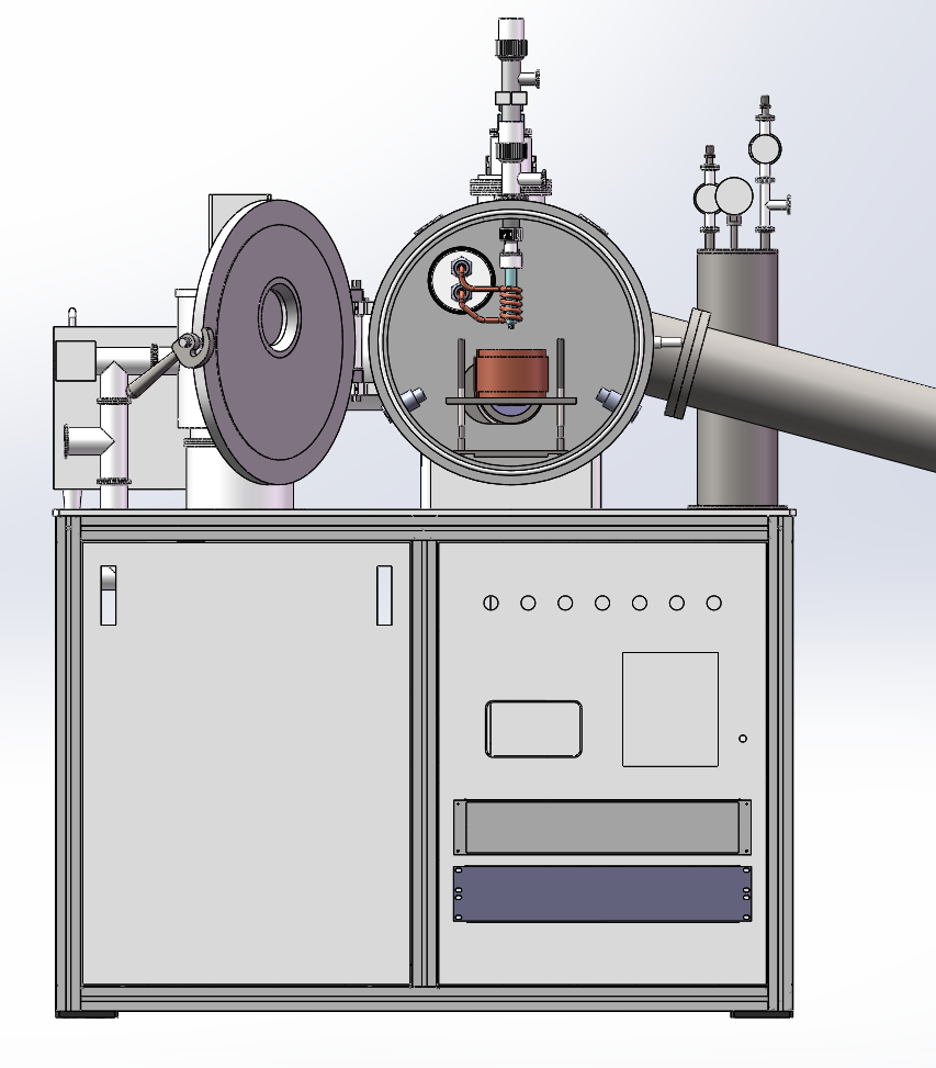 The apparatus consists of a stainless-steel, airtight chamber fitted with a front observation window. A turbo pump backed by a dual-stage oil pump can be included to achieve high vacuum levels down to 10⁻⁶ torr. Separate inlet and outlet valves allow the chamber to be purged with inert gas, protecting the melt from oxygen or moisture during processing. The system also provides independent control of the drum’s rotational speed, induction heating power, melt temperature, and the pressure applied to the crucible, enabling precise adjustment of processing parameters.