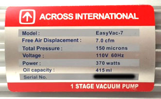 Across International EasyVac 7 single-stage sliding-vane rotary compact vacuum pump with 3/8″ hose barb vacuum connector. Comes with a 3-foot food grade silicone hose and a exhaust oil mist filter which also returns trapped pump oil back to the pump and makes the pump quieter to run. It is important to note that pumps should always be ran in a well ventilated area.